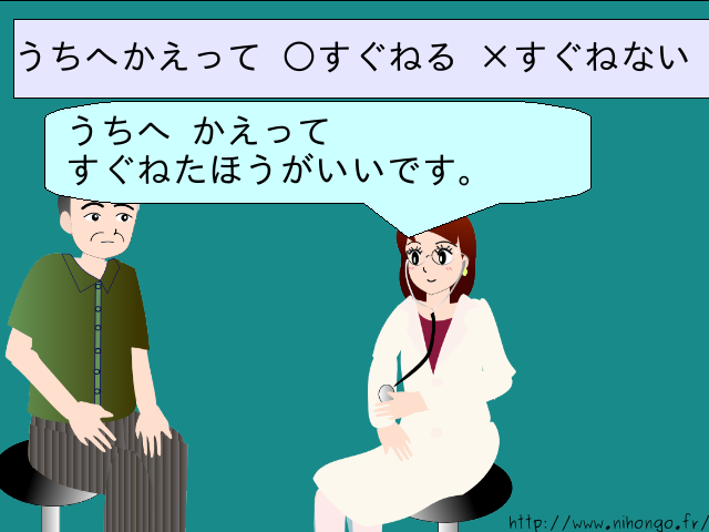 「風邪ですね。うちへ 帰って すぐ 寝た ほうが いいです。そして、お酒を 飲まない ほうが いいです。」
