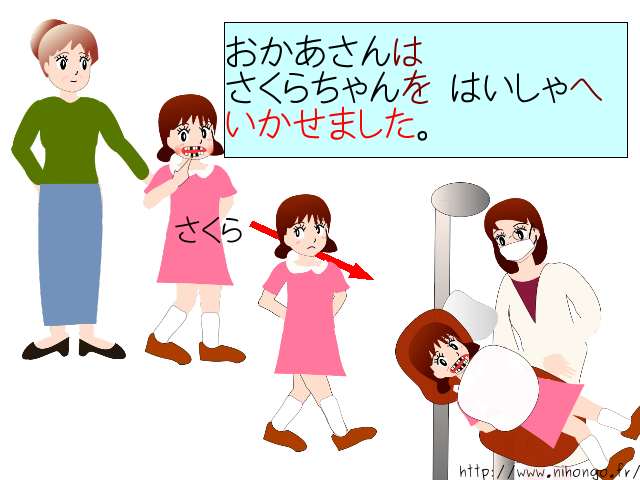 お母さんは さくらちゃんを 歯医者へ 行かせました。