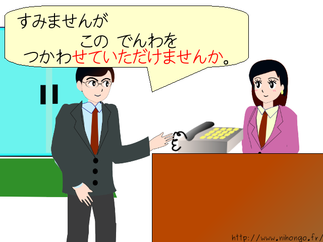「すみませんが、この 電話を 使わせて いただけませんか。」